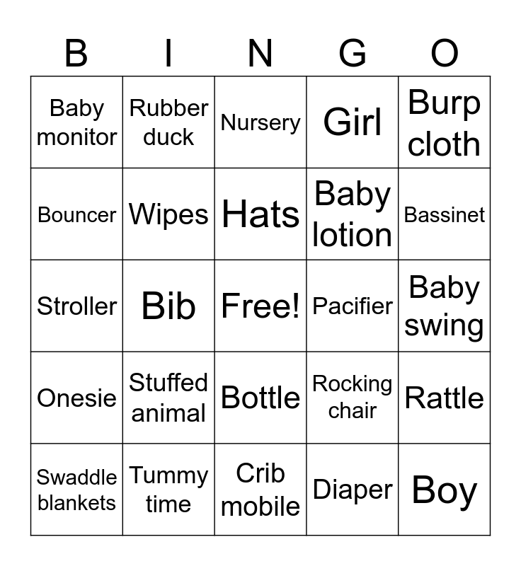 This bingo card has a free space and 32 words: Diaper, Teether, Bib, Crib, Onesie, Wipes, Burp cloth, Rattle, Rubber duck, Diaper bag, Hats, Nursery, Mittens, Lullaby, Pacifier, Bath toys, Swaddle blankets, Stroller, Bottle, Stuffed animal, Rocking chair, Formula, Baby swing, Tummy time, Boy, Girl, Baby lotion, Bouncer, Baby monitor, Crib mobile, Car seat and Bassinet.