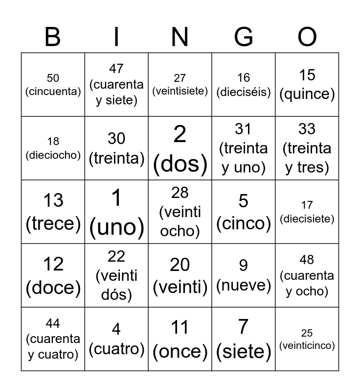 This bingo card has a free space and 24 words: 22 (veinti dós), 4 (cuatro), 2 (dos), 44 (cuarenta y cuatro), 15 (quince), 50 (cincuenta), 18 (dieciocho), 47 (cuarenta y siete), 5 (cinco), 20 (veinti), 31 (treinta y uno), 13 (trece), 9 (nueve), 48 (cuarenta y ocho), 30 (treinta), 7 (siete), 17 (diecisiete), 27 (veintisiete), 33 (treinta y tres), 1 (uno), 25 (veinticinco), 12 (doce), 16 (dieciséis) and 11 (once).