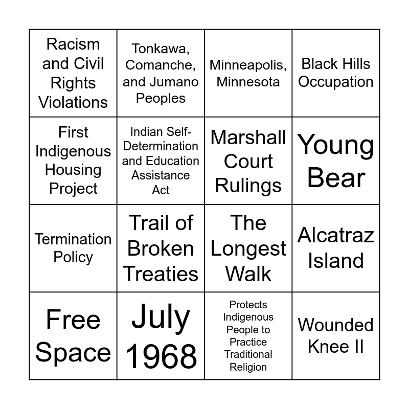 This bingo card has 16 words: July 1968, Alcatraz Island, Minneapolis, Minnesota, Racism and Civil Rights Violations, Termination Policy, Tonkawa, Comanche, and Jumano Peoples, The Longest Walk, Protects Indigenous People to Practice Traditional Religion, First Indigenous Housing Project, Indian Self-Determination and Education Assistance Act, Free Space, Black Hills Occupation, Trail of Broken Treaties, Young Bear, Marshall Court Rulings and Wounded Knee II.