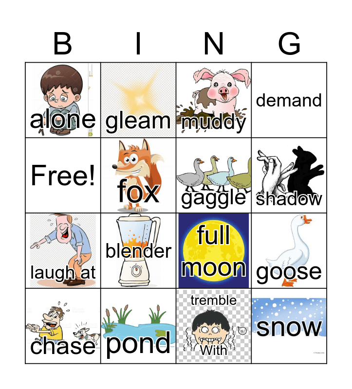 This bingo card has 14 images and 16 words: pond, goose, muddy, alone, laugh at, gleam, full moon, tremble With, Free!, fox, chase, demand, blender, shadow, gaggle and snow.