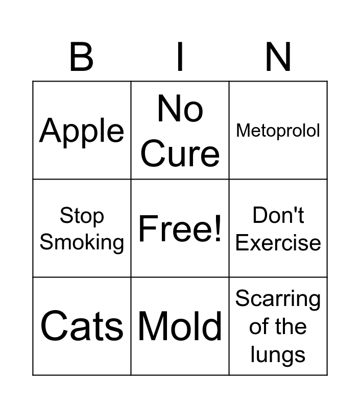 This bingo card has a free space and 8 words: Don't Exercise, Metoprolol, No Cure, Cats, Apple, Scarring of the lungs, Stop Smoking and Mold.