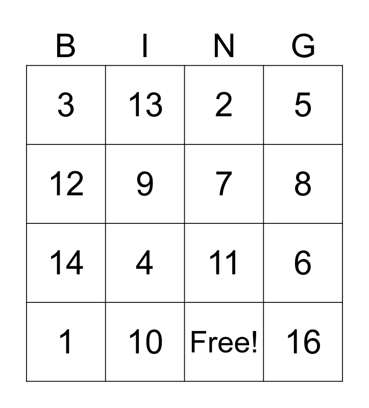 This bingo card has 17 words: Free!, 1, 2, 3, 4, 5, 6, 7, 8, 9, 10, 11, 12, 13, 14, 15 and 16.
