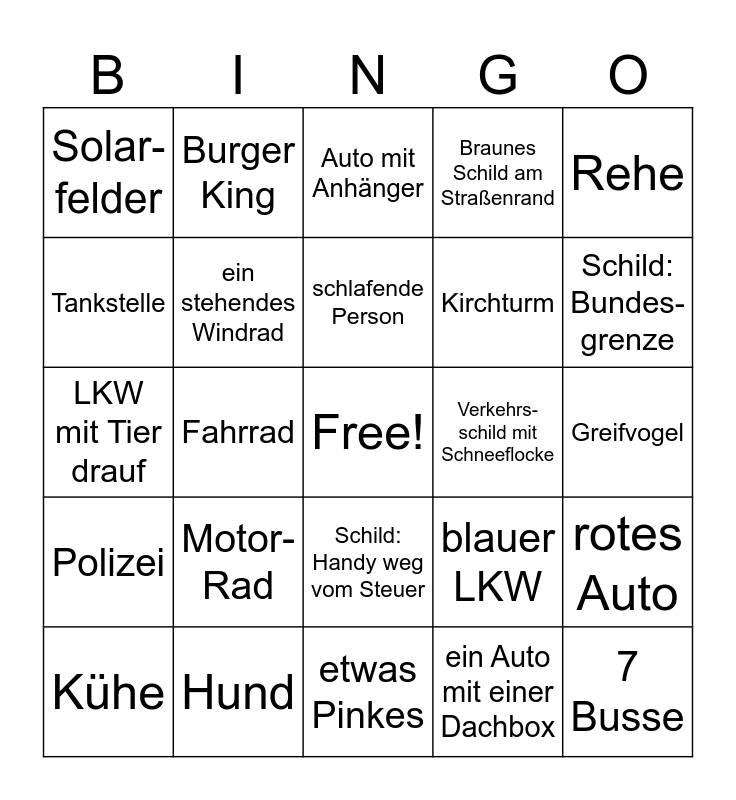 This bingo card has a free space and 24 words: Motor-Rad, Hund, schlafende Person, Kühe, Rehe, Solar-felder, Tankstelle, Burger King, Verkehrs-schild mit Schneeflocke, Schild: Handy weg vom Steuer, Kirchturm, LKW mit Tier drauf, blauer LKW, rotes Auto, ein stehendes Windrad, ein Auto mit einer Dachbox, Greifvogel, Auto mit Anhänger, Schild: Bundes-grenze, Fahrrad, 7 Busse, Polizei, Braunes Schild am Straßenrand and etwas Pinkes.