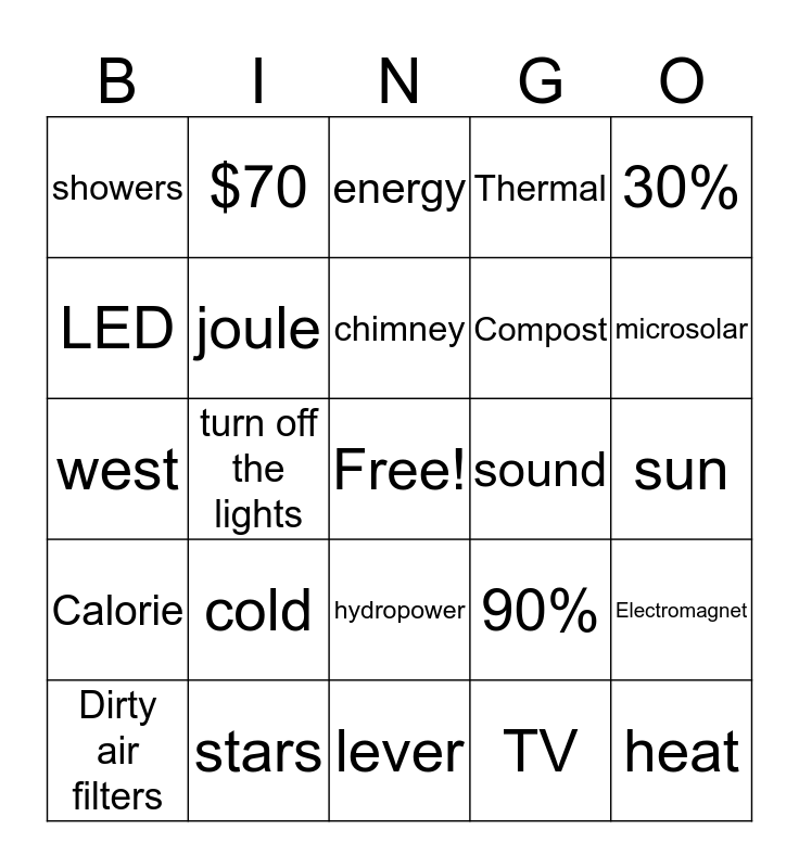 This bingo card has a free space and 30 words: stars, h2o bottles, turn off the lights, reuse, showers, energy, joule, hydropower, sound, lever, sun, heat, TV, toothbrush, microsolar, Energy efficient, 90%, Calorie, cold, 30%, west, Food/Energy, $70, Compost, LED, Thermal, Electromagnet, Dirty air filters, chimney and fuel.