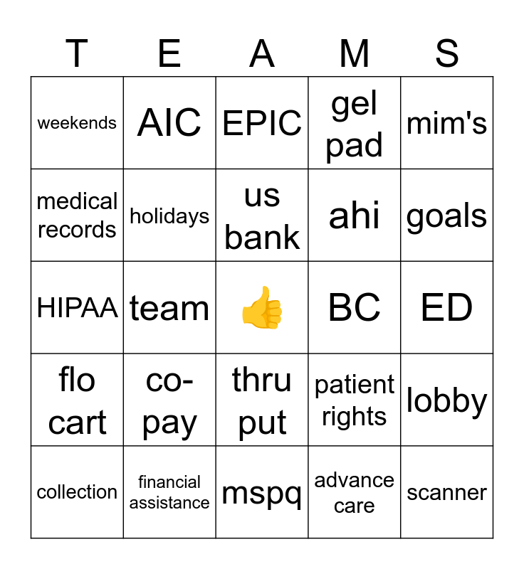 This bingo card has a free space and 24 words: co-pay, financial assistance, us bank, collection, mim's, weekends, medical records, AIC, BC, thru put, ahi, HIPAA, patient rights, lobby, holidays, advance care, ED, EPIC, goals, team, scanner, flo cart, gel pad and mspq.