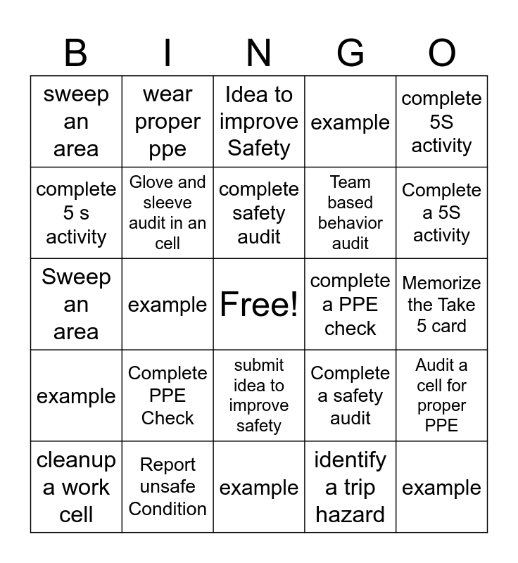 This bingo card has a free space and 24 words: Complete PPE Check, Report unsafe Condition, complete safety audit, cleanup a work cell, complete 5S activity, sweep an area, complete 5 s activity, wear proper ppe, complete a PPE check, submit idea to improve safety, Team based behavior audit, Sweep an area, Complete a safety audit, Audit a cell for proper PPE, Glove and sleeve audit in an cell, identify a trip hazard, Memorize the Take 5 card, Idea to improve Safety, Complete a 5S activity, example, example, example, example and example.