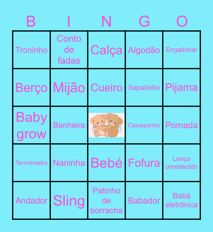 This bingo card has a free space and 87 words: Ursinho, Talco, Bebé, Mamá, Papá, Mamadeira, Biberão, Fralda, Manta, Chupeta, Chucha, Body, Lenço umedecido, Pomada, Meia, Cueiro, Papinha, Leite, Maternidade, Paternidade, Amamentação, Macacão, Baby grow, Carrinho, Babador, Babéte, Canção de ninar, Touca, Amor, Boneca, Sling, Brinquedo, Shampoo, Naninha, Berço, Cobertor, Pijama, Dente de leite, Mingau, Banheira, Gestação, Cadeirinha, Canguru, Casaquinho, Chocalho, Engatinhar, Cobertor, Conto de fadas, Madrinha, Padrinho, Móbile, Nascimento, Termômetro, Trocador, Ecografia, Umidificador, Sapatinho, Colinho, Soneca, Algodão, Mijão, Luva, Sabonete neutro, Óleos, Recém nascido, Sapatinho, Pente, Andador, Babá eletrônica, Ovo, Porta fraldas, Gorrinho, Calça, Fofura, Hidratante, Colônia, Pratinho, Patinho de borracha, Paninho de boca, Chá de bebê, Ninho, Parto, Criança, Aspirador nasal, Chuquinha, Troninho and Chá revelação.