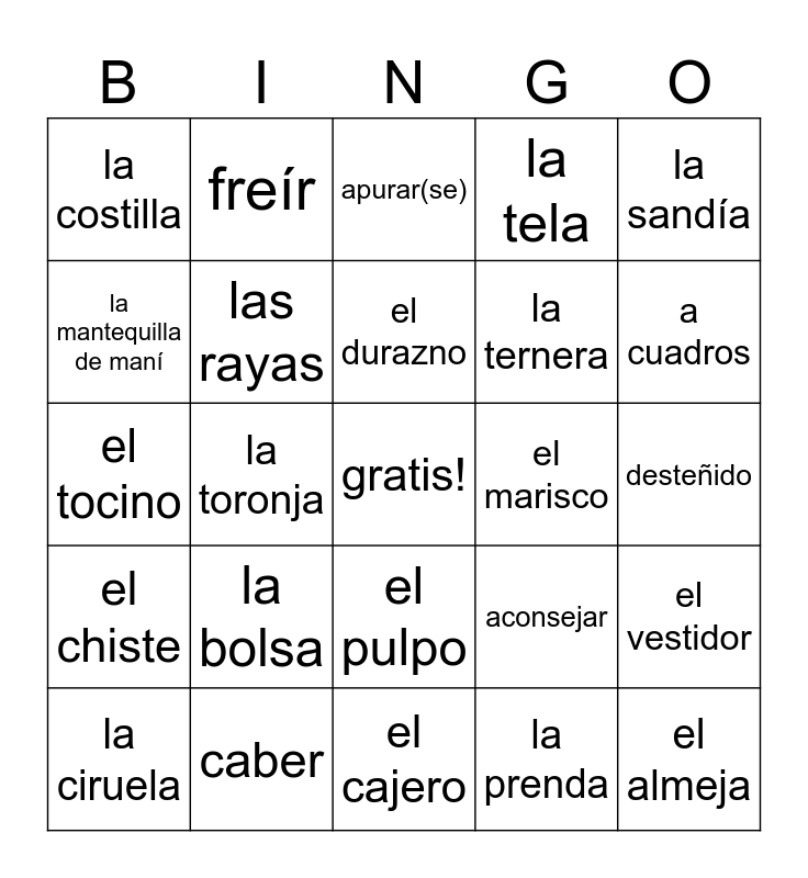 This bingo card has a free space and 24 words: la bolsa, caber, el durazno, la ciruela, la sandía, la costilla, la mantequilla de maní, freír, el marisco, el pulpo, la ternera, el tocino, aconsejar, el vestidor, las rayas, la prenda, desteñido, apurar(se), a cuadros, la toronja, el almeja, el chiste, la tela and el cajero.