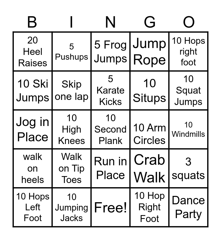 This bingo card has 25 words: walk on heels, 10 Jumping Jacks, 10 Second Plank, 10 Hop Right Foot, 10 Hops right foot, 20 Heel Raises, 5 Pushups, 5 Frog Jumps, 10 Arm Circles, 3 squats, 10 Ski Jumps, Skip one lap, Free!, Crab Walk, 10 Squat Jumps, 10 Hops Left Foot, 10 High Knees, 5 Karate Kicks, 10 Situps, 10 Windmills, Jog in Place, Walk on Tip Toes, Run in Place, Jump Rope and Dance Party.