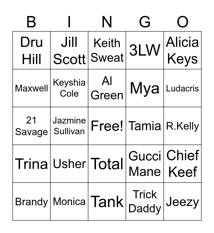 This bingo card has a free space and 24 words: Usher, Monica, Al Green, Brandy, Alicia Keys, Dru Hill, Maxwell, Jill Scott, Tamia, Total, Mya, 21 Savage, Gucci Mane, Chief Keef, Keyshia Cole, Trick Daddy, R.Kelly, Keith Sweat, Ludacris, Jazmine Sullivan, Jeezy, Trina, 3LW and Tank.