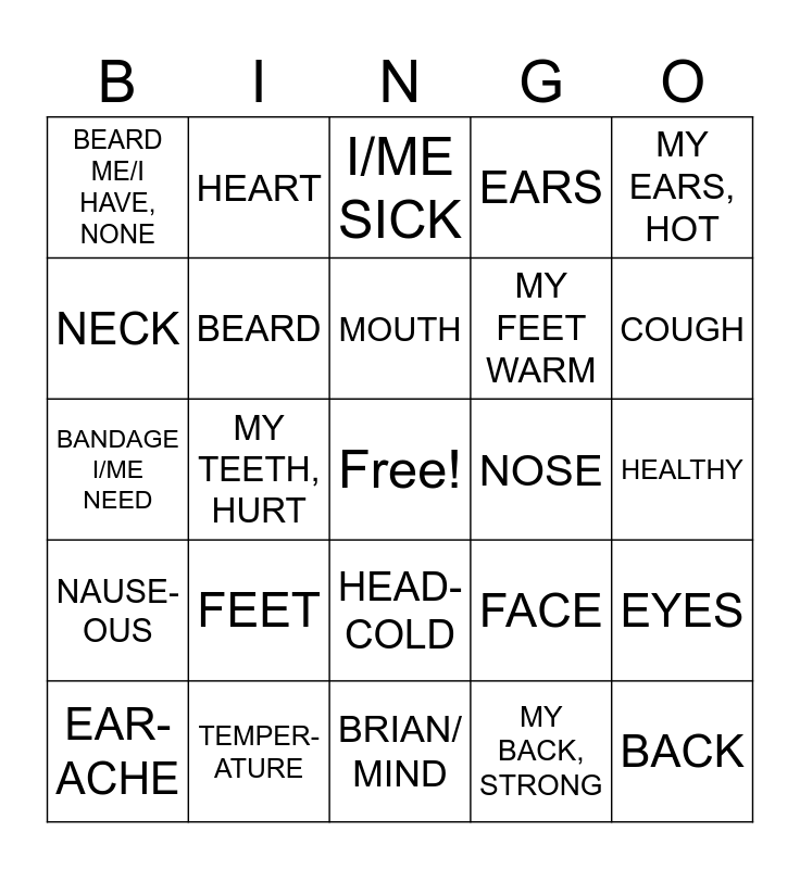 This bingo card has a free space and 49 words: ARM, BACK, BODY, BRIAN/ MIND, FEET, HANDS, HEART, LEG, NECK, STOMACH, BEARD, EARS, EYES, FACE, HAIR, HEAD, MOUTH, NOSE, TEETH, MY EARS, HOT, MY TEETH, HURT, MY BACK, STRONG, BEARD ME/I HAVE, NONE, MY FEET WARM, BREATH, COUGH, EAR-ACHE, FEVER, HEAD-COLD, NAUSE-OUS, PAIN, PALE, SICK, SNEEZE, TEMPER-ATURE, VOMIT, BANDAGE, EXAMINE, HEALTHY, PILL, HEALTHY/ RECOVER, NORMAL, SHOT/ VACCINE, TAKE-A-PILL, BANDAGE I/ME NEED, I/ME SICK, ME/I SNEEZE LOT, FEVER HIGH and COUGH, ME/I HAVE.