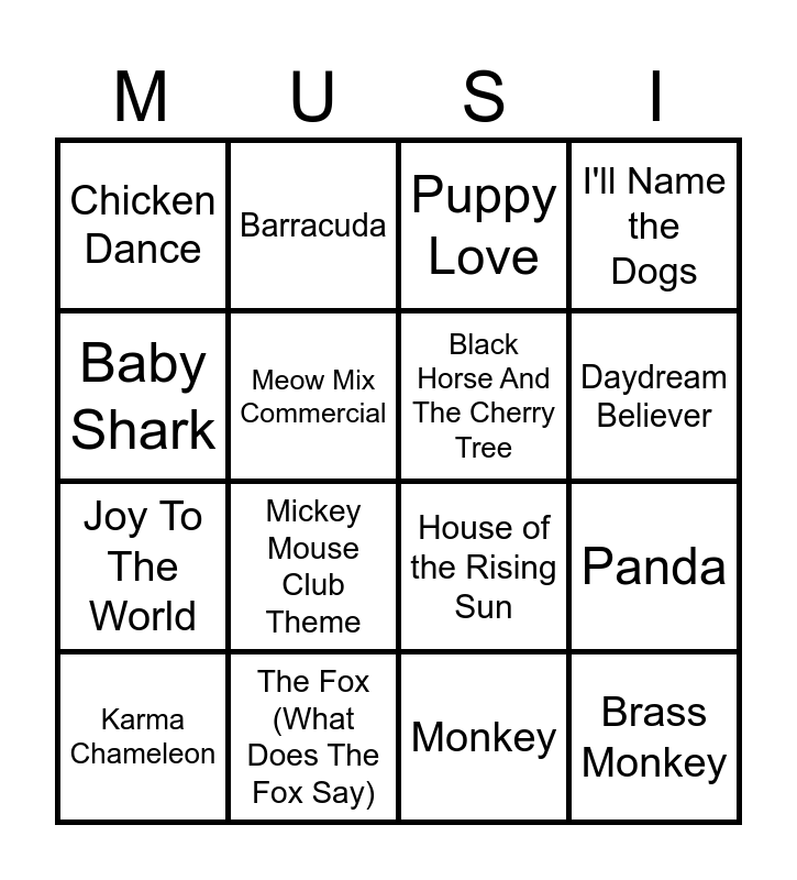 This bingo card has 1 images and 93 words: Who Let The Dogs Out, The Lion Sleeps Tonight, Crocodile Rock, Hungry Like the Wolf, What's New Pussycat?, Eye Of The Tiger, Wild Horses, The Bird Is The Word, Muskrat Love, Dog & Butterfly, Black Dog, Hound Dog, Joy To The World, Atomic Dog, Baby Shark, Puppy Love, Cat's in the Cradle, Moonshadow, Cat Scratch Fever, Black Cat, Me and You and a Dog Named Boo, Save a Horse (Ride a Cowboy), A Horse with No Name, Beer for My Horses, Black Horse And The Cherry Tree, Wildfire, Bingo (Was His Name-O), Rock Lobster, Ben, (How Much is That) Doggie in the Window, Teddy Bear, Stray Cat Strut, Goody Two Shoes, Barracuda, Free Bird, Blackbird, I'm Like A Bird, Daydream Believer, Animal, House of the Rising Sun, Brass Monkey, Monkey, Round and Round, Karma Chameleon, Spiders & Snakes, Itsy Bitsy Spider, Puff, The Magic Dragon, I've Got A Tiger By The Tail, Pour Me, I Want A Hippopotamus For Christmas, Rudolph the Red-Nosed Reindeer, Baby Elephant Walk, Spanish Flea, The Bug, Duck Tales Theme, Disco Duck, I Only Have Eyes For You, Earth Angel (Will You Be Mine), Butterfly, Panda, Cow Patti, Cow Cow Boogie, It's Peppa Pig, Baa Baa Black Sheep, Honey Bee, Centipede, Walk the Dinosaur, Meow Mix Commercial, (Theme From) The Monkees, Rockin' Robin, Save Tonight, All I Want, The Mississippi Squirrel Revival, I'll Name the Dogs, Clap For the Wolfman, Who's Afraid Of The Big Bad Wolf, Mickey Mouse Club Theme, When Doves Cry, The Bird, Mockingbird, Take It Easy, Copperhead Road, The Fox (What Does The Fox Say), Chicken Dance, Minnie the Mermaid, Dead Skunk, Dog Days Are Over, Little Donkey, May The Bird Of Paradise Fly Up Your Nose, Buffalo Stance, Mary Had A Little Lamb, See You Later, Alligator and Three Blind Mice.