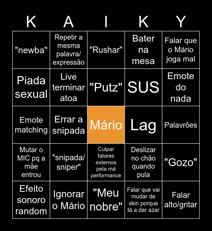 This bingo card has a free space and 28 words: "Gozo", Usar ironia quando perde, SUS, Falar que vai mudar de skin porque tá a dar azar, Piada sexual, "Rushar", Repetir a mesma palavra/ expressão, Mutar o MIC pq a mãe entrou, Lag, Efeito sonoro random, Emote matching, Bater na mesa, Ignorar o Mário, "Meu nobre", Emote do nada, Aziar, "snipada/ sniper", Live terminar atoa, "Putz", Culpar fatores externos pela má performance, "newba", "Tem um gordo", Falar alto/gritar, Errar a snipada, Palavrões, Deslizar no chão quando pula, Falar que o Mário joga mal and "Deus gamer".