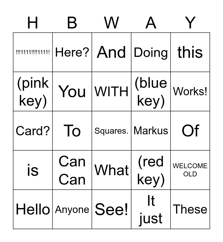 This bingo card has a free space and 29 words: Hello, Welcome (Old), To, BINGO Card Generator, !!!1111!!!!1111!, And, You, Can Can, Markus, Anyone, Of, These, See!, It just, Works!, Yeah..., What, is, this, Card?, (red key), (yellow key), (blue key), (pink key), Doing, Here?, WELCOME OLD, WITH and LYRICS.