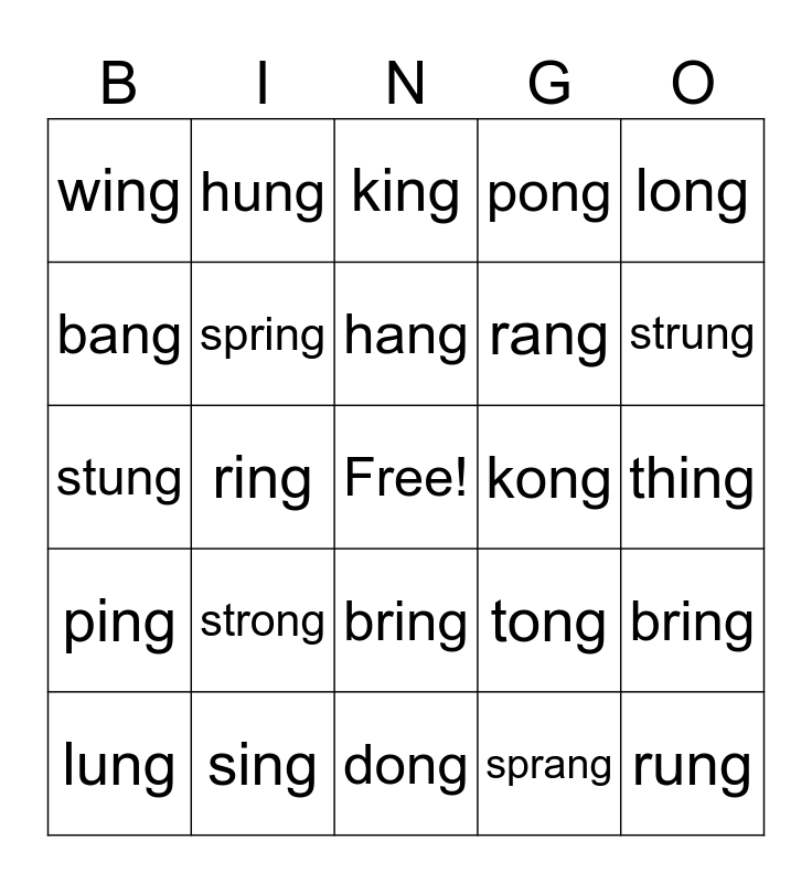 This bingo card has a free space and 24 words: strong, sing, hang, lung, long, wing, bang, hung, kong, bring, rang, stung, tong, bring, spring, sprang, thing, king, strung, ring, rung, ping, pong and dong.