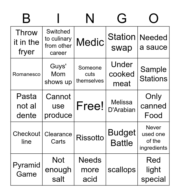 This bingo card has a free space and 29 words: Pyramid Game, Competing for a good cause, Cannot use produce, Only frozen food, Throw it in the fryer, Medic, Guys' Mom shows up, Clearance Carts, Melissa D'Arabian, Not enough salt, Only canned Food, Red light special, Needs more acid, scallops, Sample Stations, Beau MacMillan, Rissotto, Checkout line, Needed a sauce, Pasta not al dente, Budget Battle, Middle aisles only, Under cooked meat, Romanesco, Station swap, Switched to culinary from other career, Never used one of the ingredients, Someone cuts themselves and Cart swap.