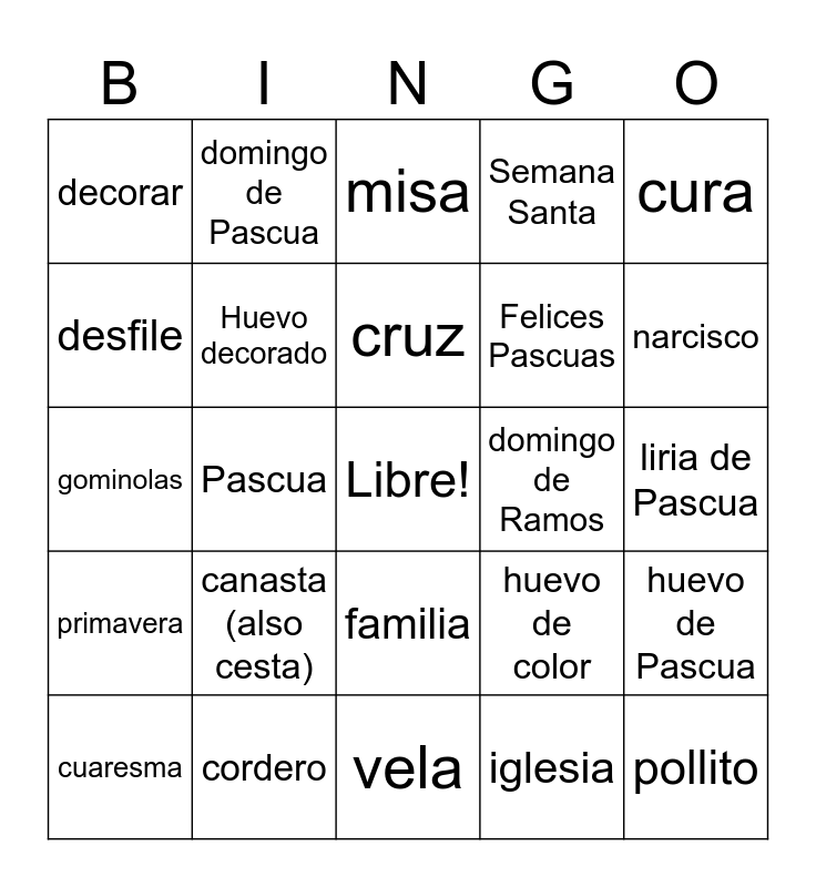 This bingo card has a free space and 24 words: canasta (also cesta), cordero, cruz, cuaresma, cura, decorar, desfile, domingo de Pascua, domingo de Ramos, familia, Felices Pascuas, gominolas, huevo de color, huevo de Pascua, Huevo decorado, iglesia, liria de Pascua, misa, narcisco, Pascua, pollito, primavera, Semana Santa and vela.