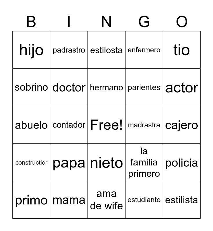 This bingo card has a free space and 24 words: papa, mama, hermano, primo, tio, hijo, sobrino, padrastro, madrastra, nieto, parientes, abuelo, la familia primero, policia, doctor, estudiante, cajero, estilosta, actor, contador, estilista, constructior, enfermero and ama de wife.