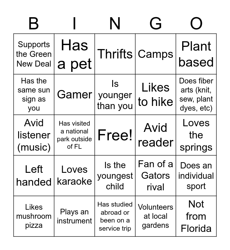 This bingo card has a free space and 43 words: Cat person, Not from Florida, Born in the same month as you, Likes mushroom pizza, Likes pepperoni pizza, Volunteers at local gardens, Thrifts, Has curly hair, Plant based, Plays an instrument, Camps, Avid reader, Is the youngest child, Loves karaoke, SBE, sustainability, engineering, or enviro science major, Has studied abroad or been on a service trip, Does yoga, Avid listener (music), Dog person, Does fiber arts (knit, sew, plant dyes, etc), Has a pet, Went to Santa Fe College, Is a CWC energy coach, Supports the Green New Deal, Enjoys outdoor adventure sports, Loves the springs, Is wearing shoes with no laces, Studies botany, forestry, or herbalism, Fan of a Gators rival, Left handed, Plays a team sport, Does an individual sport, Enjoys cooking, Has visited a national park outside of FL, Has freckles, Goes by a nickname, Is in a class with you, Is younger than you, Has the same sun sign as you, Likes to hike, Likes to paddle, Gamer and Learning code.