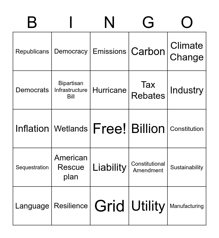 This bingo card has a free space and 26 words: Liability, Utility, Hurricane, Resilience, Climate Change, Republicans, Democrats, Democracy, Constitution, Constitutional Amendment, Tax Rebates, Inflation, Sustainability, Language, Wetlands, Poison, Carbon, Sequestration, Emissions, Manufacturing, Industry, Grid, Billion, American Rescue plan, Bipartisan Infrastructure Bill and Broadband.