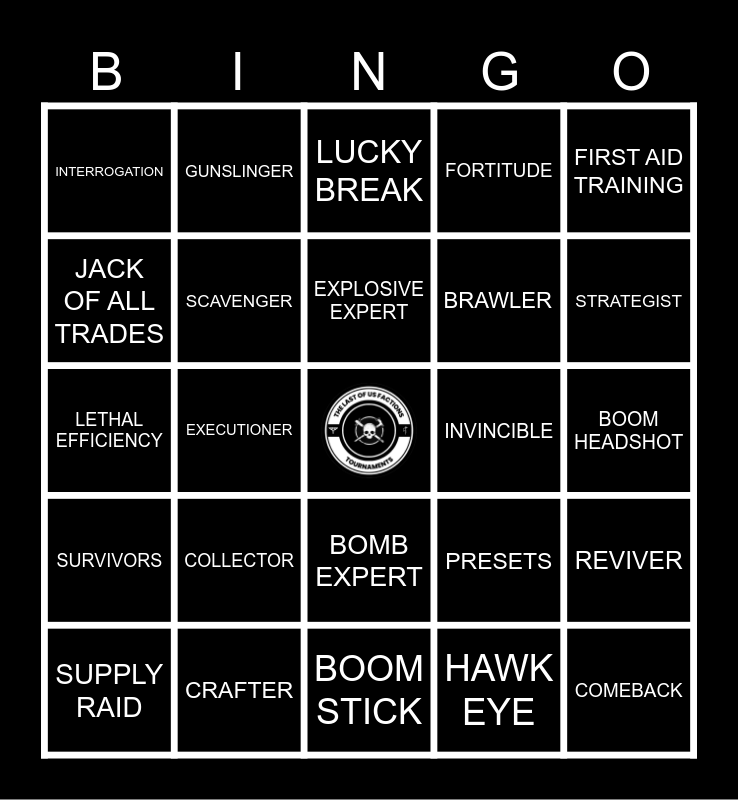 This bingo card has a free space and 24 words: COLLECTOR, CRAFTER, EXPLOSIVE EXPERT, SUPPLY RAID, FIRST AID TRAINING, INTERROGATION, JACK OF ALL TRADES, GUNSLINGER, INVINCIBLE, BOMB EXPERT, BRAWLER, LETHAL EFFICIENCY, PRESETS, REVIVER, SCAVENGER, HAWK EYE, BOOM HEADSHOT, LUCKY BREAK, STRATEGIST, EXECUTIONER, COMEBACK, SURVIVORS, FORTITUDE and BOOM STICK.