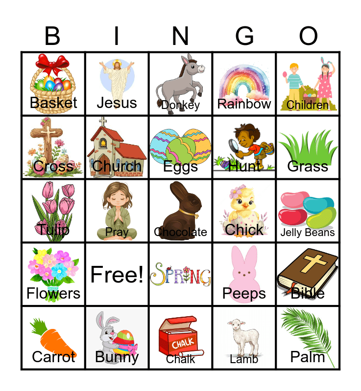 This bingo card has 23 images, a free space and 23 words: Free!, Bunny, Eggs, Carrot, Children, Basket, Cross, Jesus, Chick, Hunt, Tulip, Peeps, Bible, Church, Lamb, Jelly Beans, Donkey, Grass, Pray, Palm, Flowers, Rainbow and Chalk.