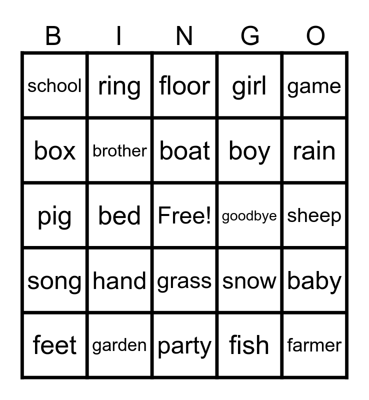 This bingo card has a free space and 45 words: farm, farmer, father, feet, fire, fish, floor, flower, game, garden, girl, goodbye, grass, hand, head, party, picture, pig, rabbit, rain, ring, robin, Santa Claus, school, seed, sheep, shoe, sister, snow, song, apple, baby, back, ball, bear, bed, bell, bird, birthday, boat, box, boy, bread, brother and cake.
