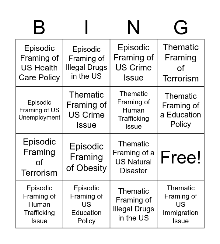 This bingo card has 20 words: Free!, Episodic Framing of a US Natural Disaster, Episodic Framing of US Crime Issue, Episodic Framing of US Immigration Issue, Episodic Framing of Human Trafficking Issue, Episodic Framing of US Unemployment, Episodic Framing of US Education Policy, Episodic Framing of US Health Care Policy, Episodic Framing of Terrorism, Episodic Framing of Illegal Drugs in the US, Episodic Framing of Obesity, Thematic Framing of a US Natural Disaster, Thematic Framing of US Crime Issue, Thematic Framing of US Immigration Issue, Thematic Framing of Human Trafficking Issue, Thematic Framing of US Unemployment, Thematic Framing of a Education Policy, Thematic Framing of Terrorism, Thematic Framing of Illegal Drugs in the US and Thematic Framing of Obesity.