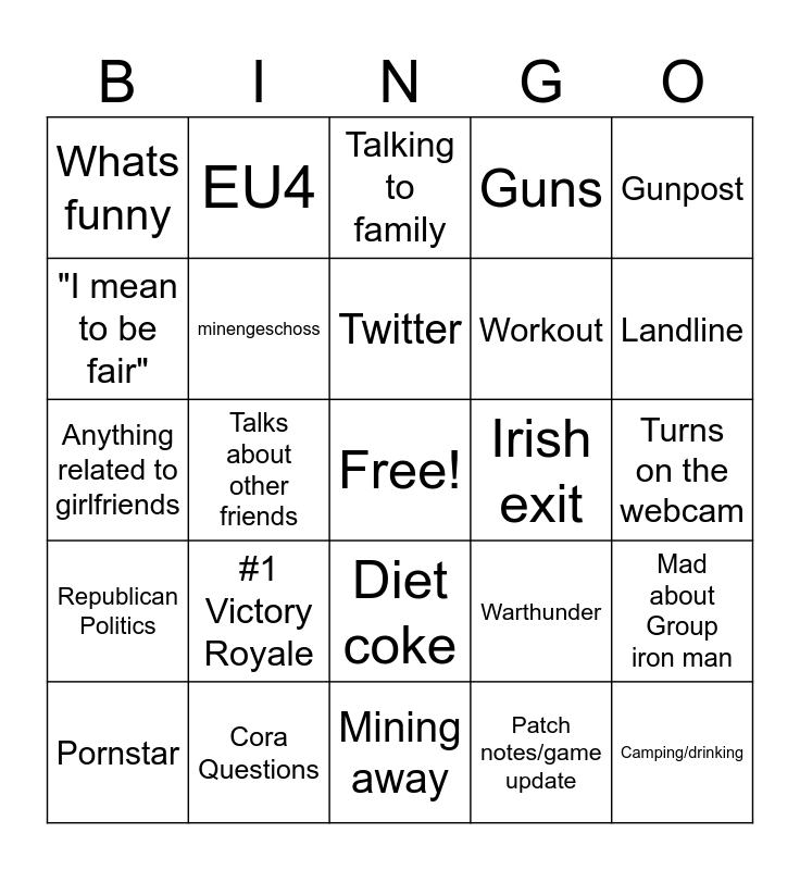 This bingo card has a free space and 24 words: #1 Victory Royale, Cora Questions, Twitter, Pornstar, Gunpost, Whats funny, "I mean to be fair", EU4, Irish exit, Diet coke, Workout, Anything related to girlfriends, Warthunder, Mad about Group iron man, minengeschoss, Patch notes/game update, Turns on the webcam, Talking to family, Landline, Talks about other friends, Camping/drinking, Republican Politics, Guns and Mining away.
