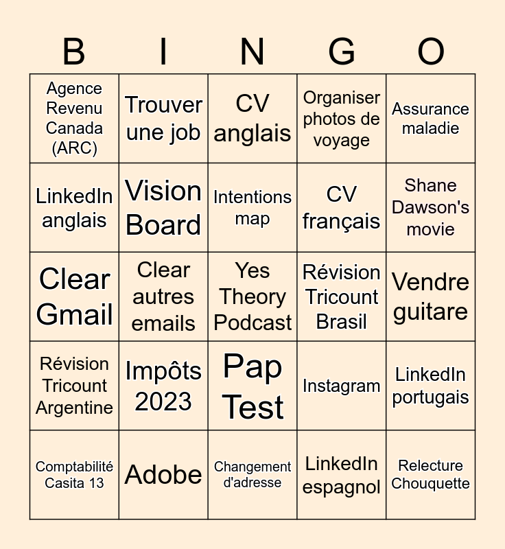 This bingo card has 25 words: Impôts 2023, Changement d'adresse, Intentions map, Comptabilité Casita 13, Assurance maladie, Agence Revenu Canada (ARC), LinkedIn anglais, Trouver une job, Révision Tricount Brasil, Pap Test, CV français, Clear Gmail, Instagram, LinkedIn portugais, Vision Board, Relecture Chouquette, Vendre guitare, CV anglais, Shane Dawson's movie, Clear autres emails, Yes Theory Podcast, Adobe, Révision Tricount Argentine, Organiser photos de voyage and LinkedIn espagnol.