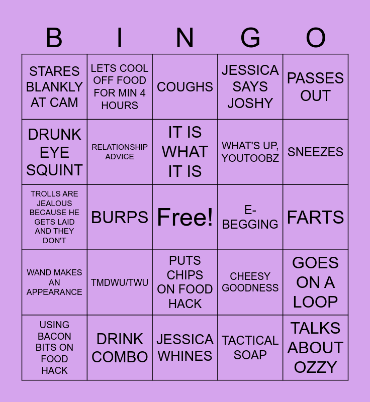 This bingo card has a free space and 24 words: TMDWU/TWU, DRINK COMBO, IT IS WHAT IT IS, USING BACON BITS ON FOOD HACK, PASSES OUT, STARES BLANKLY AT CAM, DRUNK EYE SQUINT, LETS COOL OFF FOOD FOR MIN 4 HOURS, E-BEGGING, PUTS CHIPS ON FOOD HACK, WHAT'S UP, YOUTOOBZ, TROLLS ARE JEALOUS BECAUSE HE GETS LAID AND THEY DON'T, CHEESY GOODNESS, GOES ON A LOOP, RELATIONSHIP ADVICE, TACTICAL SOAP, FARTS, COUGHS, SNEEZES, BURPS, TALKS ABOUT OZZY, WAND MAKES AN APPEARANCE, JESSICA SAYS JOSHY and JESSICA WHINES.