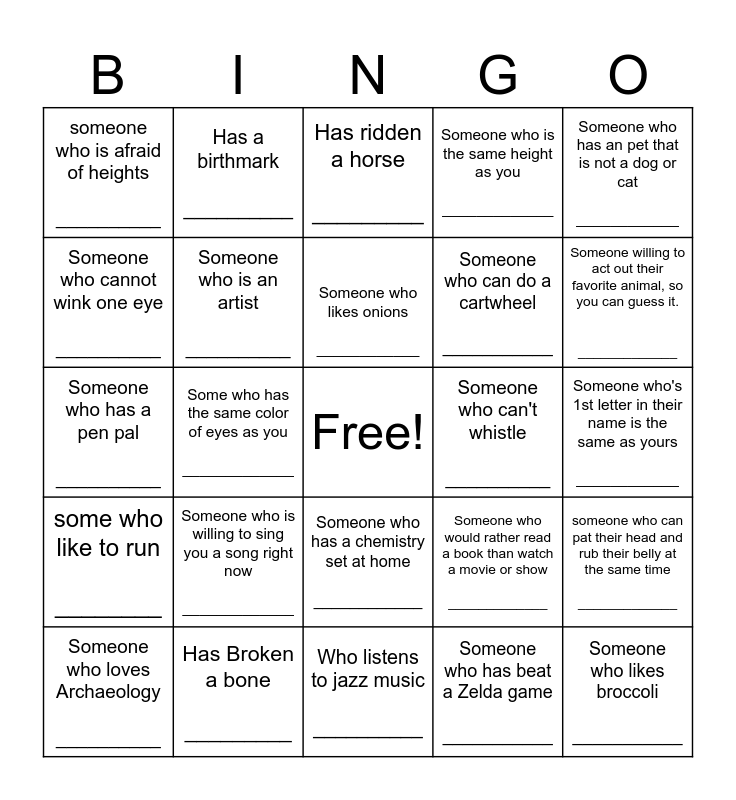 This bingo card has a free space and 39 words: Has the same birthday as you __________, Doesn't like chocolate _________, Is left handed _________, Someone who is an artist __________, Someone who loves Archaeology __________, Someone who has a chemistry set at home ____________, Someone who likes onions ____________, Who hates pineapple on their pizza _________, Someone who has an pet that is not a dog or cat ____________, some who like to run ________, Some who has the same color of eyes as you _____________, Someone who is the same height as you _____________, Someone who likes broccoli ___________, Someone who's 1st letter in their name is the same as yours ____________, Someone who can't whistle __________, Someone who is willing to sing you a song right now _____________, Someone who doesn't know your name ____________, someone who is afraid of heights __________, Someone who can spell your name correctly ____________, Someone who would rather read a book than watch a movie or show _____________, Someone who cannot wink one eye __________, Who listens to jazz music __________, Someone who can do a cartwheel ___________, Someone willing to act out their favorite animal, so you can guess it. _____________, Has read the whole Bible __________, Can say all the books of the bible from Memory _____________, Can speak two languages ___________, Has lived in another state __________, Has visited another country ___________, Has a birthmark __________, Has made dinner for their family all by themselves _____________, knows the four states of matter __________, Has ridden a horse _________, Has Broken a bone _________, Someone who has beat a Zelda game ___________, Someone who will sing happy birthday like an opera singer for you _______________, someone who can pat their head and rub their belly at the same time _____________, Someone who has a pen pal __________ and Someone who would rather save money rather than spend it _____________.
