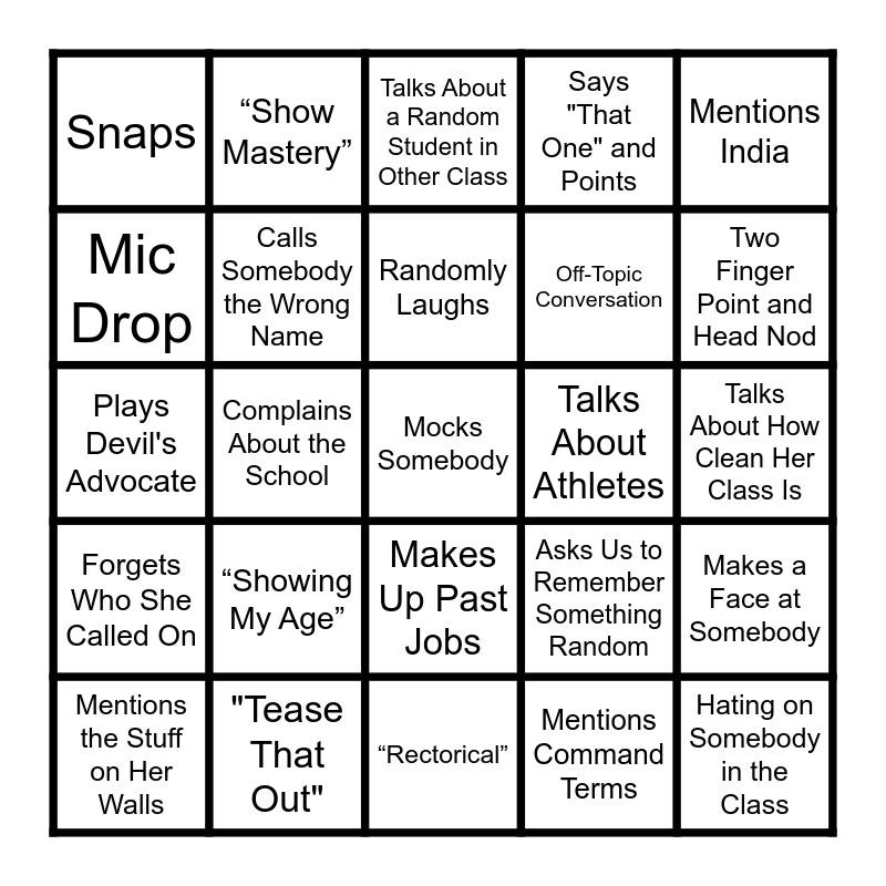 This bingo card has 35 words: Free Space, Mentions Her Kids, Mentions Switching Schools, Calls Somebody the Wrong Name, Makes Up Past Jobs, Says "That One" and Points, Mic Drop, Story From Her Childhood, Randomly Laughs, "Take a Deeper Dive", Plays Devil's Advocate, Mentions India, Mentions Chicago, Complains About People Not Taking Notes, Snaps, Talks About Athletes, Mentions Command Terms, Complains About the School, Forgets Who She Called On, Mocks Somebody, Asks Us to Remember Something Random, Mentions the Stuff on Her Walls, Makes a Face at Somebody, "Tease That Out", Talks About a Random Student in Other Class, Two Finger Point and Head Nod, Hating on Somebody in the Class, Accidently Turns Off Board, Off-Topic Conversation, Talks About How Clean Her Class Is, “Read the Board”, “Rectorical”, “Showing My Age”, “Show Mastery” and “Period Full Stop”.
