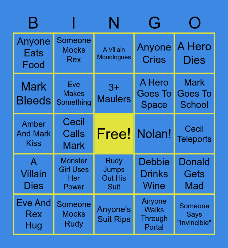 This bingo card has a free space and 24 words: Monster Girl Uses Her Power, Someone Mocks Rudy, 3+ Maulers, Eve And Rex Hug, A Hero Dies, Anyone Eats Food, Mark Bleeds, Someone Mocks Rex, Nolan!, Rudy Jumps Out His Suit, A Hero Goes To Space, Amber And Mark Kiss, Debbie Drinks Wine, Donald Gets Mad, Eve Makes Something, Anyone Walks Through Portal, Cecil Teleports, A Villain Monologues, Mark Goes To School, Cecil Calls Mark, Someone Says "Invincible", A Villain Dies, Anyone Cries and Anyone's Suit Rips.