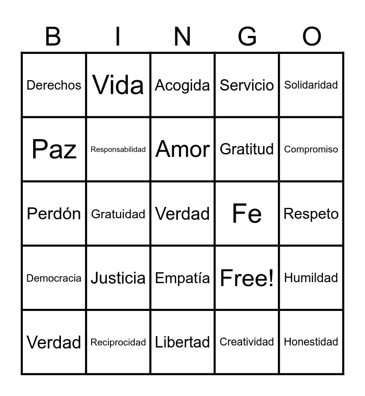 This bingo card has 25 words: Justicia, Libertad, Amor, Verdad, Solidaridad, Derechos, Paz, Vida, Fe, Empatía, Gratitud, Perdón, Free!, Humildad, Responsabilidad, Honestidad, Respeto, Acogida, Compromiso, Gratuidad, Verdad, Reciprocidad, Democracia, Servicio and Creatividad.