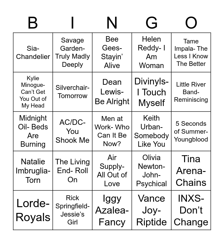 This bingo card has 29 words: Lorde- Royals, Flight of the Concords- The Most Beautiful Girl (in the room), AC/DC- You Shook Me, INXS- Don’t Change, Sia-Chandelier, Bee Gees- Stayin’ Alive, Silverchair- Tomorrow, The Living End- Roll On, Keith Urban- Somebody Like You, Rick Springfield- Jessie’s Girl, 5 Seconds of Summer- Youngblood, Men at Work- Who Can It Be Now?, Iggy Azalea- Fancy, Vance Joy- Riptide, Little River Band-Reminiscing, Gotye- Somebody That I Used To Know, Air Supply- All Out of Love, Natalie Imbruglia- Torn, Tame Impala- The Less I Know The Better, Midnight Oil- Beds Are Burning, Olivia Newton- John- Psychical, Jet- Are You Gonna Be My Girl, Divinyls- I Touch Myself, Kylie Minogue- Can’t Get You Out of My Head, Helen Reddy- I Am Woman, Savage Garden- Truly Madly Deeply, Tina Arena- Chains, Dean Lewis- Be Alright and The Beths- Future Me Hates Me.