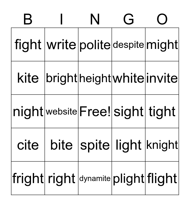 This bingo card has a free space and 24 words: bite, right, height, fright, might, fight, kite, write, sight, spite, white, night, light, knight, bright, plight, tight, polite, invite, website, flight, cite, despite and dynamite.