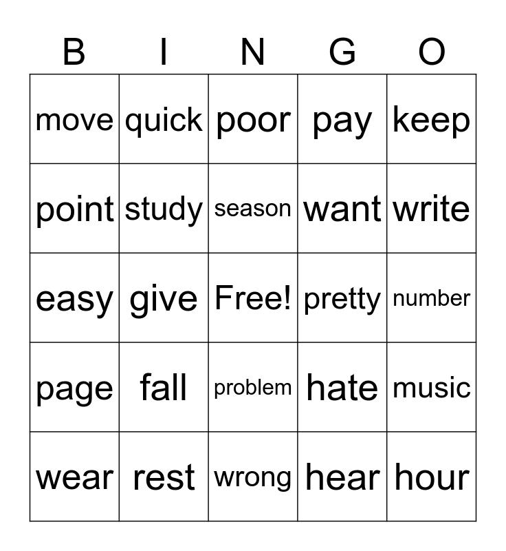 This bingo card has a free space and 24 words: fall, rest, season, wear, keep, move, point, quick, pretty, problem, want, easy, hate, music, study, hear, number, poor, write, give, hour, page, pay and wrong.