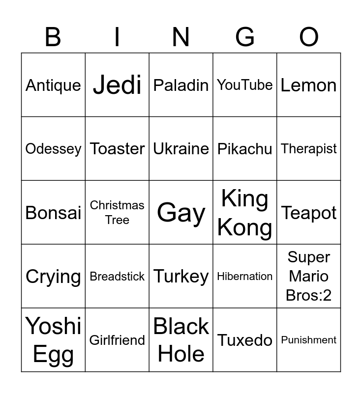 This bingo card has a free space and 24 words: Breadstick, Girlfriend, Ukraine, Yoshi Egg, Lemon, Antique, Odessey, Jedi, King Kong, Turkey, Pikachu, Bonsai, Hibernation, Super Mario Bros:2, Toaster, Tuxedo, Teapot, Paladin, Therapist, Christmas Tree, Punishment, Crying, YouTube and Black Hole.