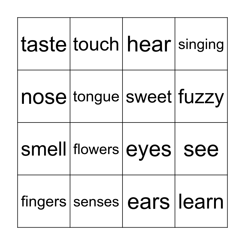 This bingo card has 16 words: senses, see, hear, taste, smell, touch, eyes, ears, nose, tongue, fingers, singing, flowers, fuzzy, sweet and learn.
