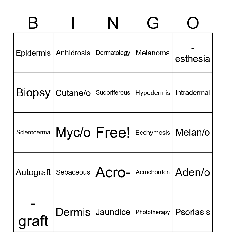 This bingo card has a free space and 24 words: Sebaceous, Dermis, Sudoriferous, -graft, -esthesia, Epidermis, Biopsy, Anhidrosis, Ecchymosis, Acro-, Hypodermis, Scleroderma, Acrochordon, Aden/o, Cutane/o, Phototherapy, Melan/o, Dermatology, Intradermal, Myc/o, Psoriasis, Autograft, Melanoma and Jaundice.