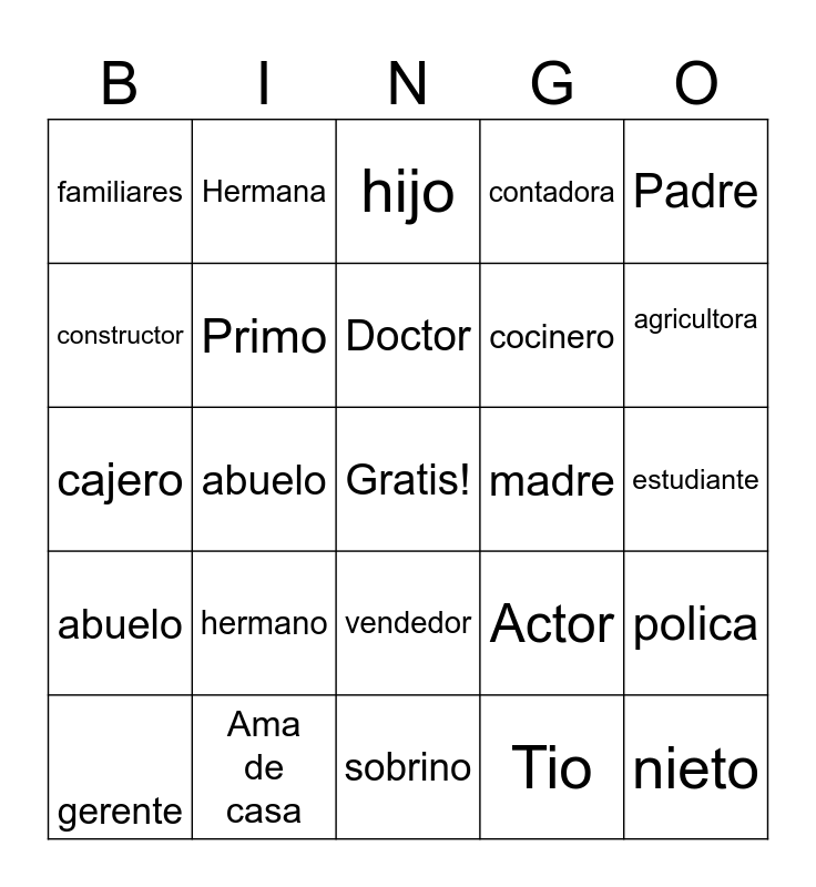 This bingo card has a free space and 24 words: hermano, Ama de casa, Doctor, gerente, Padre, familiares, constructor, Hermana, madre, vendedor, cocinero, cajero, Actor, polica, Primo, Tio, estudiante, hijo, agricultora, abuelo, nieto, abuelo, contadora and sobrino.