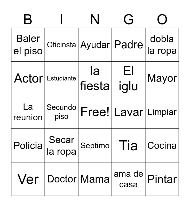 This bingo card has a free space and 24 words: Ver, Secar la ropa, la fiesta, ama de casa, dobla la ropa, Baler el piso, Oficinsta, Ayudar, Lavar, Limpiar, La reunion, Estudiante, Tia, Cocina, Actor, Doctor, Mama, Padre, Mayor, Policia, Secundo piso, Septimo, El iglu and Pintar.