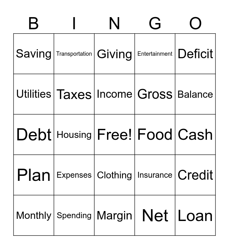 This bingo card has a free space and 24 words: Expenses, Spending, Income, Monthly, Deficit, Saving, Utilities, Transportation, Food, Clothing, Gross, Debt, Insurance, Credit, Taxes, Net, Cash, Giving, Balance, Housing, Loan, Plan, Entertainment and Margin.