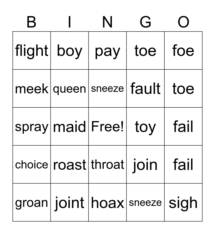 ⚠ This card has duplicate items: flight (3), goat (3), hoax (3), night (3), sigh (3), groan (3), roast (3), throat (3), doe (3), foe (3), meek (3), queen (3), sneeze (3), toe (3), fail (3), maid (3), pay (3), drain (3), pail (3), snail (3), spray (3), boy (3), join (3), toy (3), choice (3), joint (3), oink (3), fault (3), launch (3), draw (3), hawk (3)