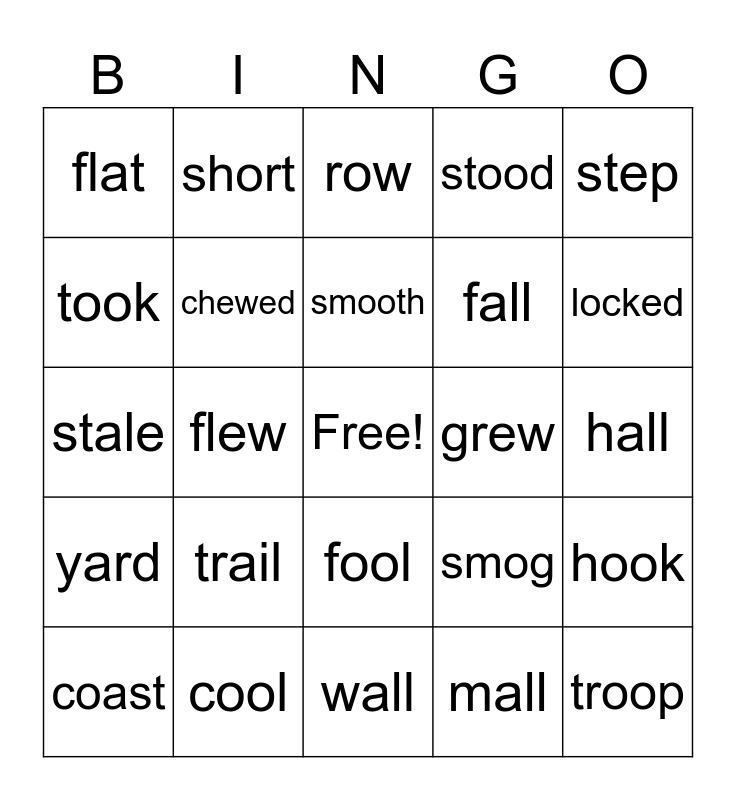 This bingo card has a free space and 24 words: trail, cool, smooth, coast, step, flat, took, short, grew, fool, fall, stale, smog, hook, chewed, mall, hall, row, locked, flew, troop, yard, stood and wall.