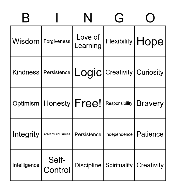 This bingo card has a free space and 74 words: Social awareness, Cooperation, Love of Learning, Leadership, Discipline, Self-Control, Humor, Modesty, Intelligence, Wisdom, Humor, Adventurousness, Logic, Kindness, Gratitude, Honesty, Bravery, Curiosity, Fairness, Optimism, Persistence, Forgiveness, Flexibility, Patience, Creativity, Ambition, Integrity, Enthusiasm, Responsibility, Empathy, Hope, Athleticism, Independence, Assertiveness, Confidence, Spirituality, Artistic Ability, Cooperation, Love of Learning, Leadership, Discipline, Self-Control, Humor, Modesty, Intelligence, Wisdom, Humor, Adventurousness, Logic, Kindness, Gratitude, Honesty, Bravery, Curiosity, Fairness, Optimism, Persistence, Forgiveness, Flexibility, Patience, Creativity, Ambition, Integrity, Enthusiasm, Responsibility, Empathy, Hope, Athleticism, Independence, Assertiveness, Confidence, Spirituality, Artistic Ability and Social awareness.