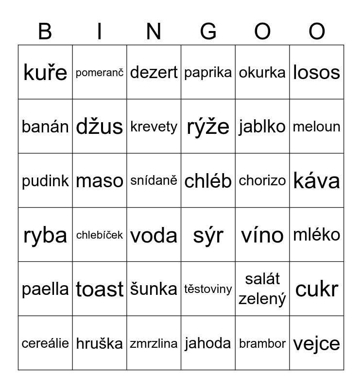 This bingo card has 36 words: těstoviny, šunka, jahoda, banán, ryba, chléb, džus, zmrzlina, okurka, salát zelený, meloun, paprika, cukr, maso, rýže, kuře, paella, chorizo, pudink, dezert, snídaně, chlebíček, sýr, voda, víno, pomeranč, jablko, hruška, krevety, losos, vejce, cereálie, mléko, káva, toast and brambor.