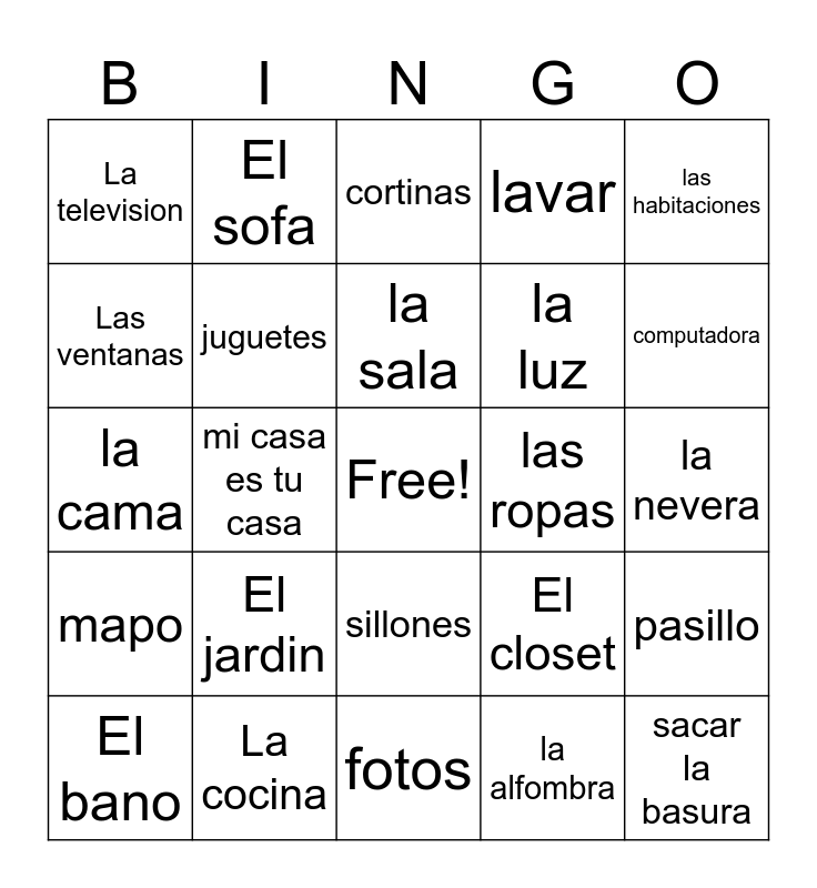This bingo card has a free space and 24 words: El jardin, La cocina, la sala, El bano, las habitaciones, La television, Las ventanas, El sofa, las ropas, sillones, la luz, la cama, El closet, pasillo, juguetes, la alfombra, la nevera, cortinas, computadora, mi casa es tu casa, sacar la basura, mapo, lavar and fotos.