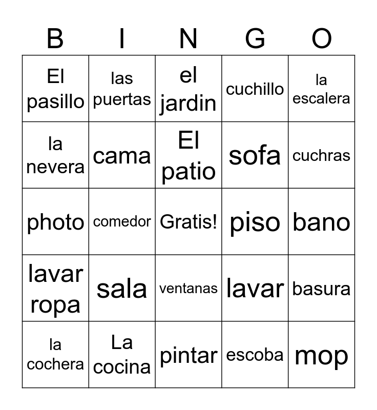 This bingo card has a free space and 24 words: sala, La cocina, El patio, la cochera, la escalera, El pasillo, la nevera, las puertas, piso, ventanas, sofa, photo, lavar, basura, cama, escoba, bano, el jardin, cuchras, comedor, mop, lavar ropa, cuchillo and pintar.